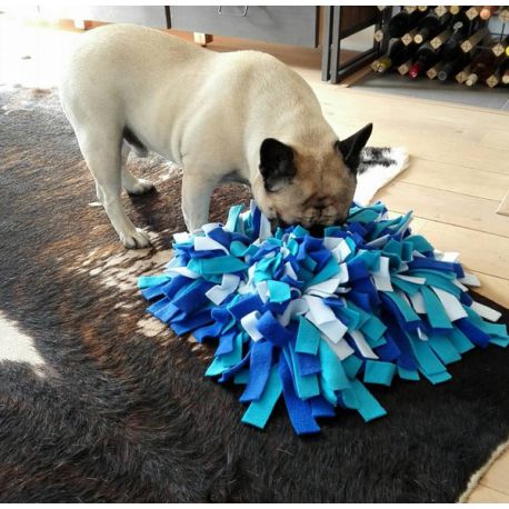 La plupart des chiens mangent en un temps record, environ une vingtaine de secondes. Il est beaucoup plus stimulant pour eux de prendre du temps pour chercher leur nourriture. On réveille ainsi leurs instincts de chasse et de recherche. Ainsi, un tapis de fouille est le moyen idéal pour prolonger le moment du repas d’une manière saine. C’est un produit idéal pour les chiens qui en viennent à s’étouffer en mangeant trop rapidement et, en plus, c’est un excellent moyen de le stimuler et donc de le fatiguer.